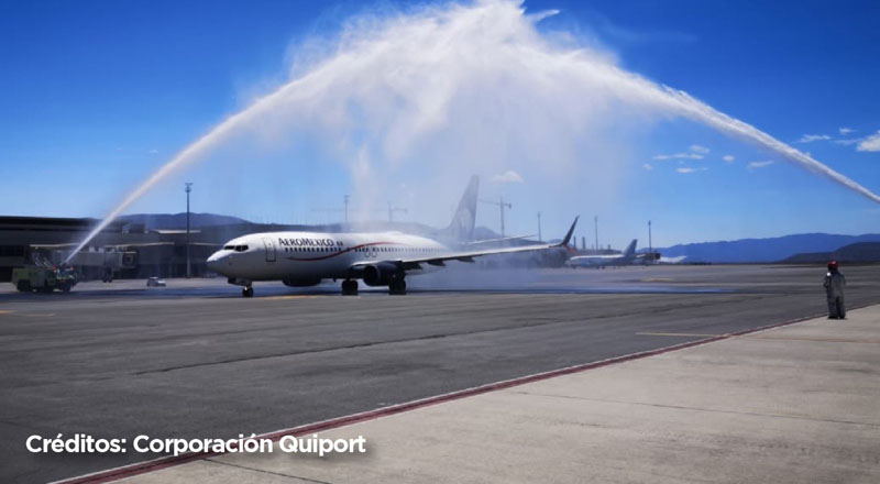 Aeroméxico reinició operaciones este domingo a Quito desde la Ciudad de México, con una oferta de tres vuelos semanales. Para celebrar el regreso de la aerolínea a Ecuador, el Aeropuerto Internacional Mariscal Sucre de Quito, realizó el tradicional bautizo del avión.