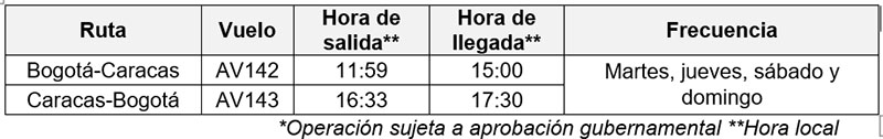 “Nos hace muy felices volver a conectar a Bogotá y a todos los rincones de Colombia con Venezuela; y al mismo tiempo, brindarles a nuestros clientes más y mejores oportunidades para conectar desde Caracas con una red de 60 destinos en 23 países**. Esta ruta la operamos por más de 60 años ininterrumpidamente y sin duda nos enorgullece estar de regreso con cuatro vuelos semanales que esperamos poder incrementar próximamente. Seguiremos trabajando en conjunto como hasta ahora con las autoridades de Venezuela y Colombia para hacer que esta ruta sea un éxito”, dijo Carolina Cortés, vicepresidente de Comunicaciones Corporativas de Avianca.