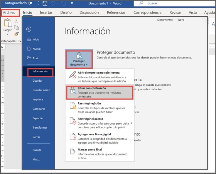 Mediante herramientas del paquete Microsoft Office: Una de las opciones más simples, es recurrir directamente al cifrado disponible en las herramientas de Microsoft Office (Word, Excel, etc.) y luego cargar el archivo ya encriptado a Google Drive. La opción para encriptación, según la versión de la herramienta, se encuentra en la pestaña archivos (o file en inglés), opción información (o info) donde el usuario puede seleccionar una opción que dirá “Proteger documento”, “cifrar” o “encrypt” y seguir las instrucciones que automáticamente le indica la herramienta.