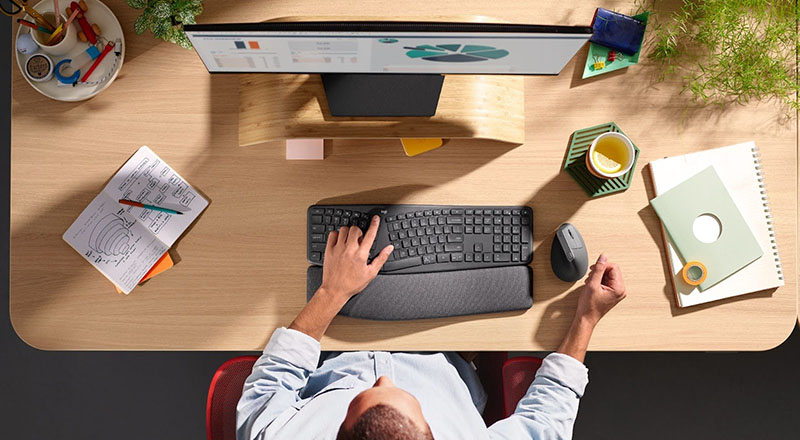 • Periféricos ergonómicos: están diseñados para alinear naturalmente las muñecas y antebrazos, reduciendo la tensión muscular y previniendo la fatiga durante largas jornadas laborales. Gracias a su ángulo de inclinación, reposamanos integrado y diseño basado en estudios del Logitech Ergolab, estos dispositivos ayudan a disminuir la presión en manos, codos y hombros. Además, cuentan con certificaciones internacionales de ergonomía, que avalan su efectividad en la reducción del esfuerzo físico y la mejora del confort postural.