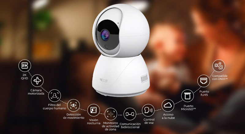 La cámara inteligente motorizada para interior NHC-IP10 ofrece resolución 2K con funciones avanzadas de rotación horizontal (355º), zoom e inclinación vertical (55º) que permiten monitorear espacios amplios desde un único punto de instalación. “Esta cámara incorpora visión nocturna y dispone de conectividad Wi-Fi de doble banda, además de ser compatible con el protocolo ONVIF para integrarse con otros sistemas de seguridad”, afirmó Cristhian Leal.