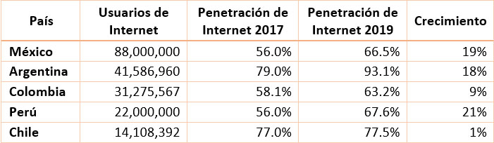De acuerdo con Internet World Stats y el estudio de hábitos de usuario de Linio, desde el 2017, el porcentaje de penetración de Internet en la población de la región creció en promedio un 13%; siendo Perú el país con mayor incremento con 21%, seguido de México con 19%, luego está Argentina con 18% y Colombia en cuarto lugar con un 9%. En Chile, el crecimiento penas es del 1%, sin embargo, sigue siendo el país con mayor acceso para sus habitantes a las conexiones web.