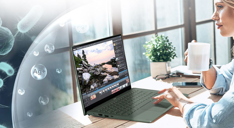 Se ha demostrado que un agente antimicrobiano de iones de plata compatible con BPR y EPA en el revestimiento de la superficie del chasis, el teclado, la bisagra, el lector de huellas digitales e incluso las etiquetas, presenta una tasa consistente de reducción microbiana de [3 log (>99,9 %)2] en un amplio rango de bacterias bajo el protocolo de prueba JIS Z 2801 e ISO 22196. Incluso, Acer ha incluido este material antimicrobiano basado en iones de plata en las bases de goma del equipo.