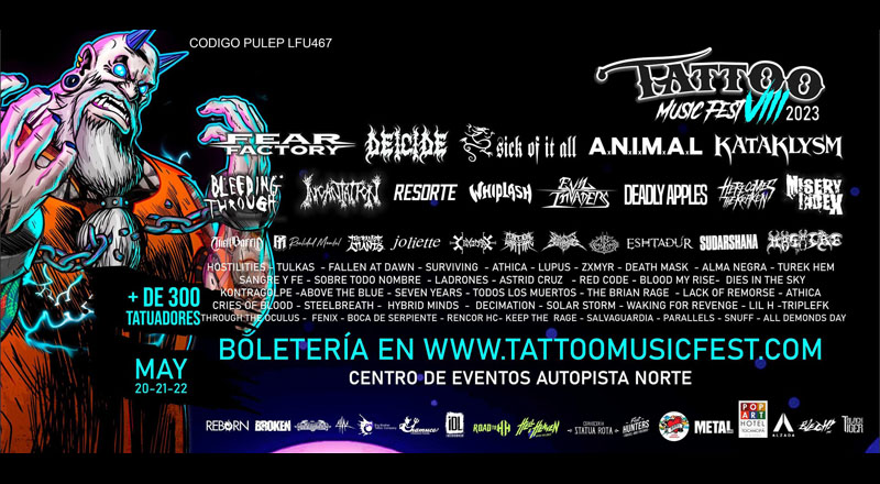 Llega a Bogotá, el Tattoo Music Fest, la fiesta de tattoos y música más grande de Colombia. En esta ocasión, el festival celebra su octava edición por lo grande, con un cartel de bandas alucinante que viajan desde las rimas del Hip – Hop, hasta los acordes turbios y pesados del Metal. Con más de 40   agrupaciones, entre ellas, muchas legendarias y reconocidas mundialmente junto a más de 300 tatuadores, colectivos locales y marcas independientes se dan cita este 20,21 y 22 de mayo de 2023 en el Centro de Eventos Autopista Norte para poner a gozar a todos los asistentes a esta gran experiencia llena de tatuajes, música y diversión.