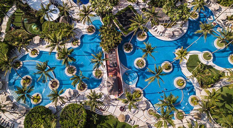 3.-The Westin Resort & Spa: Un espacio renovado, diseñado por el reconocido arquitecto Juan Sordo Madaleno que respetó la naturaleza del lugar, rodeado por más de 600 palmeras que representan toda la exuberancia de un destino de playa. Son dos piscinas climatizadas unidas por una isla con camastros, y facilidades para personas con movilidad reducida.