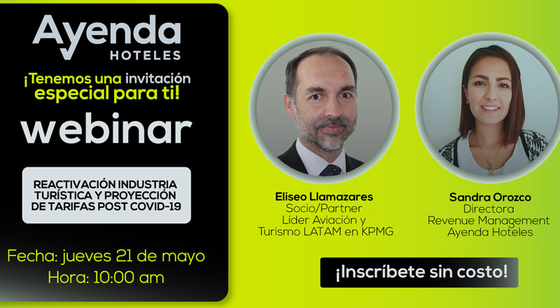 El evento se realizará este jueves 21 de mayo a las 10:00 am, y estará a cargo de Eliseo Llamazares, Socio / Partner Líder Aviación y Turismo LATAM en KPMG; y Sandra Orozco, Directora Revenue Management en Ayenda Hoteles.